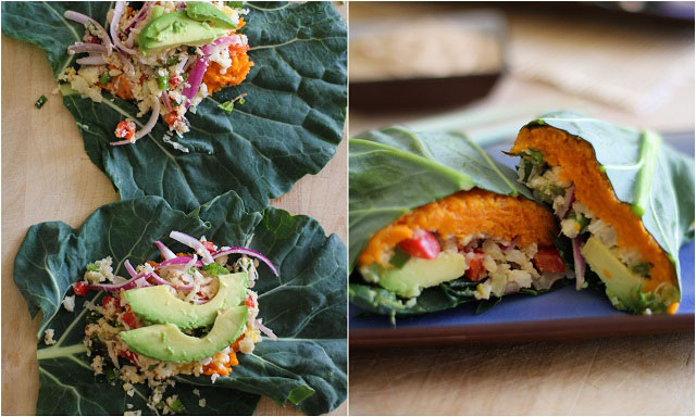 1. Roasted Sweet Potato and Cauliflower Rice Collard Wraps